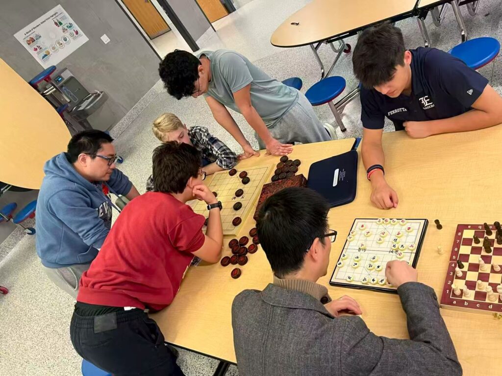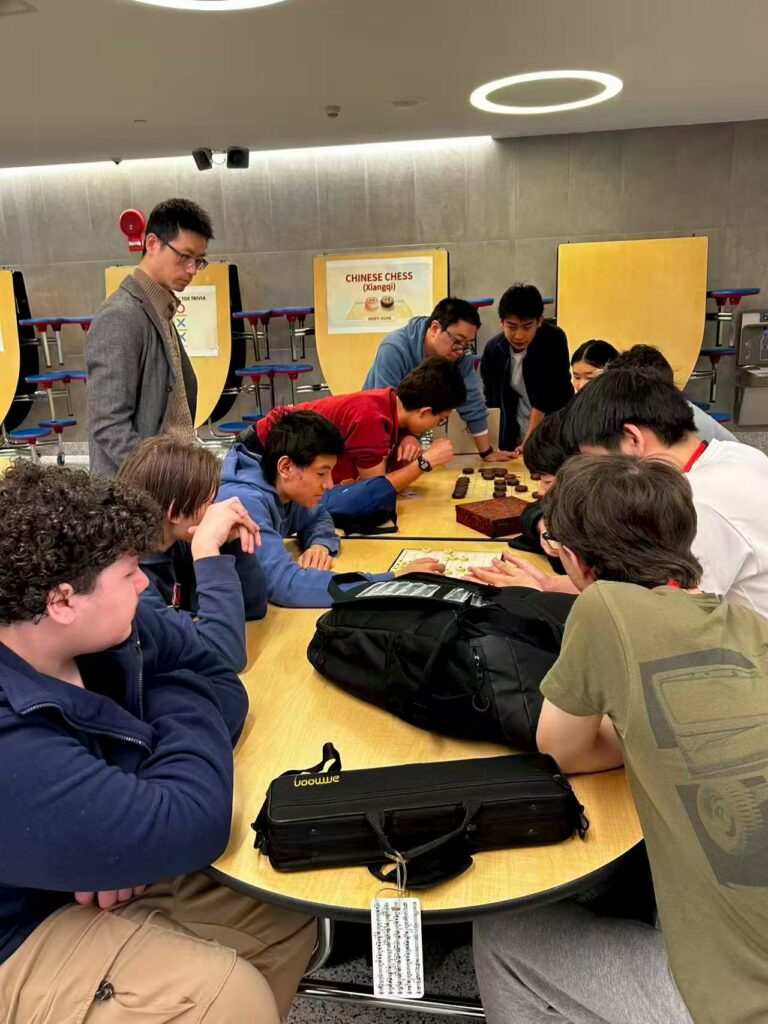 作为本次互动的亮点之一,中国象棋区域吸引了许多爱好益智游戏的同学。不同族裔的学生被这种充满策略魅力的东方博弈所吸引,展台前围满了观战和对弈的人群,现场气氛活跃,成为了促进学生跨文化交流的绝佳平台。